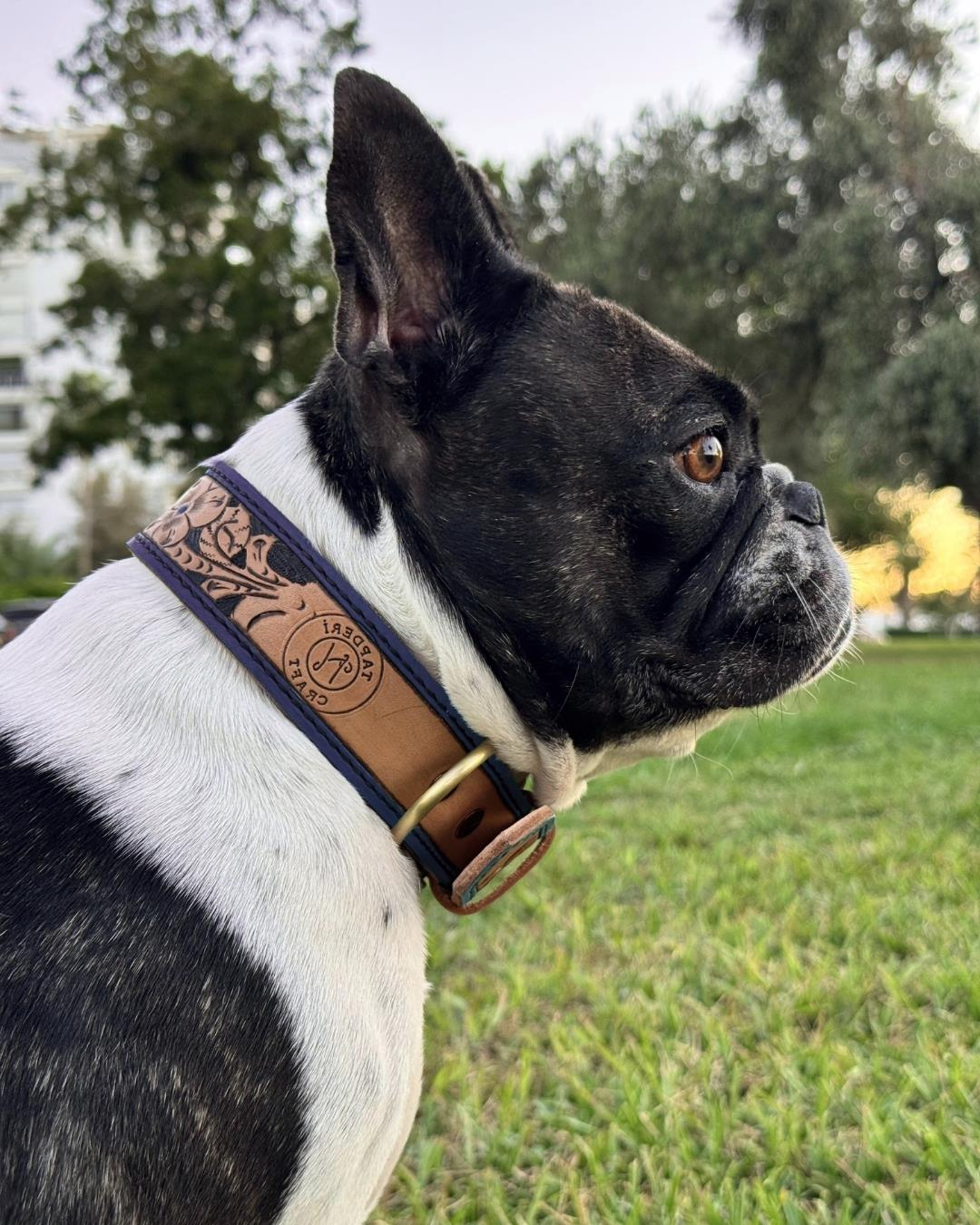 Bu özel tasma, tamamen el işçiliğiyle özenle işlenmiş %100 gerçek deriden üretilmiştir. Sheridan tarzı çiçek motifleri, turkuaz detaylarla birleşerek köpeğinizin şıklığını ön plana çıkarır. Dayanıklı yapısı sayesinde uzun ömürlü kullanım sunar.