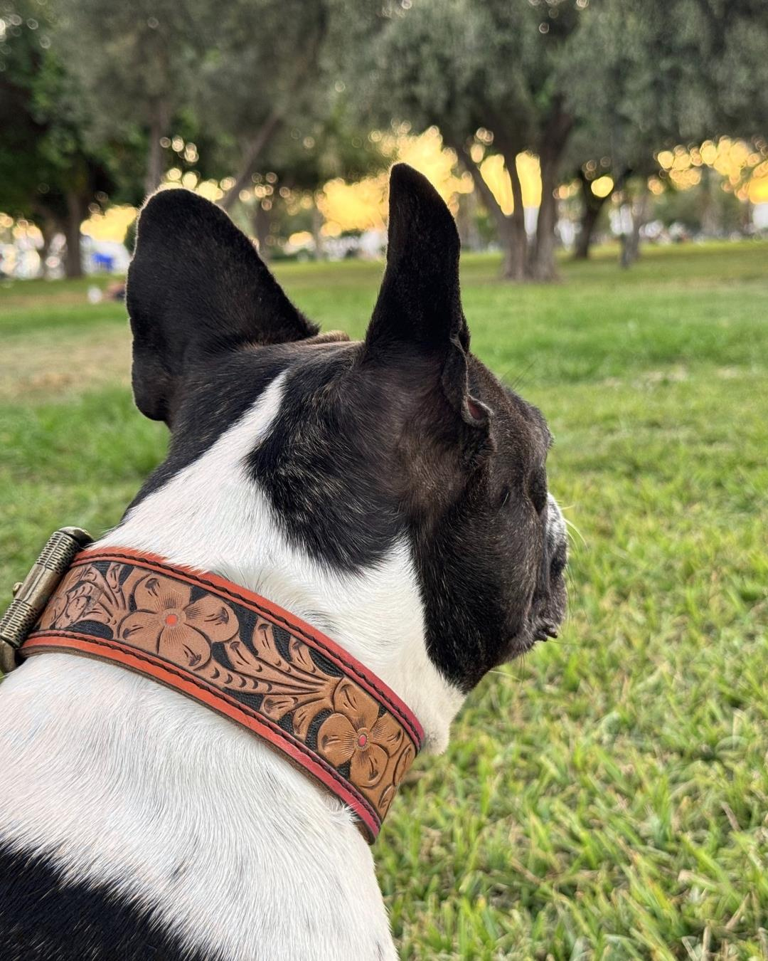 Bu özel tasma, tamamen el işçiliğiyle özenle işlenmiş %100 gerçek deriden üretilmiştir. Sheridan tarzı çiçek motifleri, turkuaz detaylarla birleşerek köpeğinizin şıklığını ön plana çıkarır. Dayanıklı yapısı sayesinde uzun ömürlü kullanım sunar.