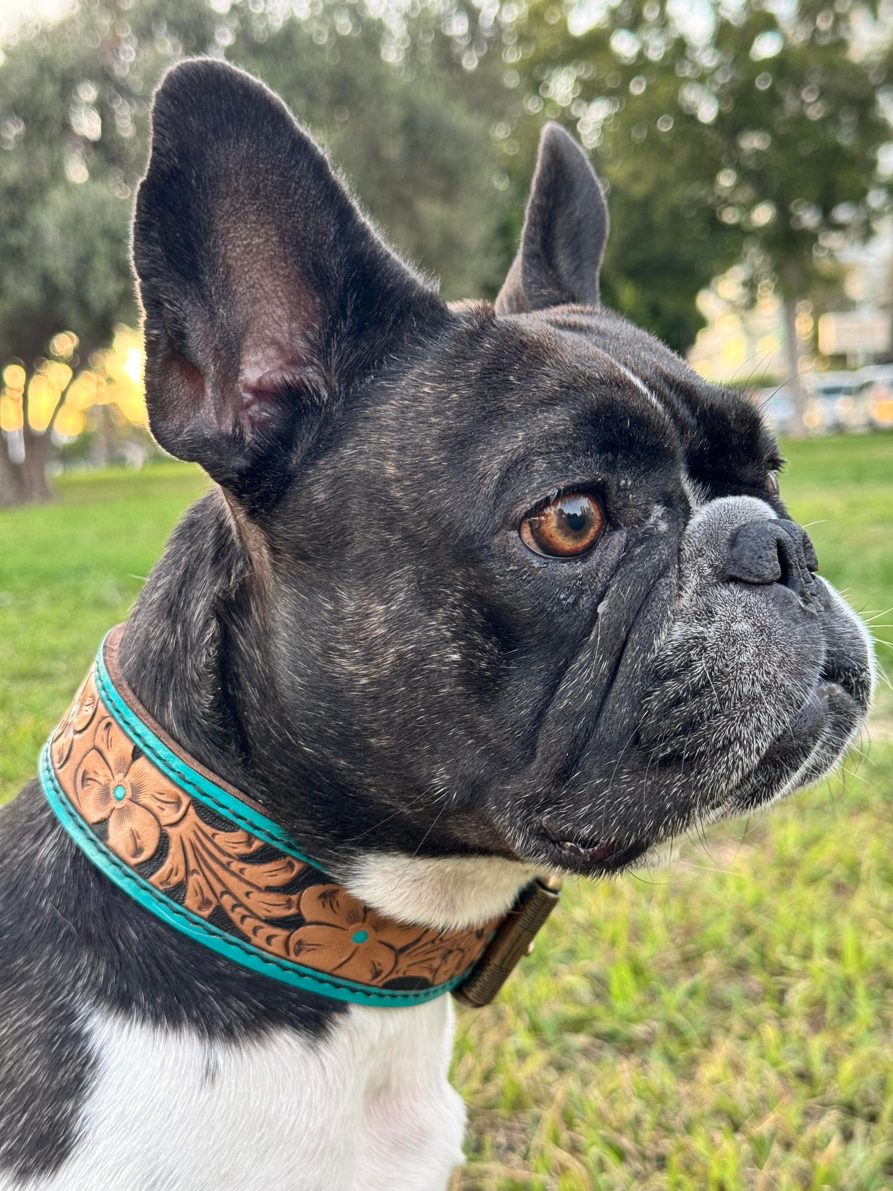 Bu özel tasma, tamamen el işçiliğiyle özenle işlenmiş %100 gerçek deriden üretilmiştir. Sheridan tarzı çiçek motifleri, turkuaz detaylarla birleşerek köpeğinizin şıklığını ön plana çıkarır. Dayanıklı yapısı sayesinde uzun ömürlü kullanım sunar.